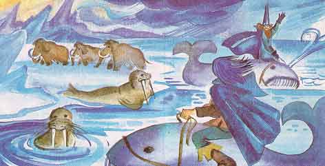 Оба колдуна прикидывались добрыми друзьями и ездили друг к другу с визитами на китах во всю прыть, так что вода так и кипела кругом. Места, кажется, было вдоволь каждому в своей части света, но они все-таки постоянно завидовали друг другу, и каждый только и думал о том, как бы досадить другому. Они разукрасили свои владения высокими горами, одна выше другой, только для того, чтобы с вершин наблюдать, что каждый делает в своем жилище. Громадное удовольствие доставляло им устраивать бури с вихрем, чтобы хорошенько засорить друг другу глаза песком и мелкими камнями. Еще они занимались тем, что один науськивал белых медведей на скотину другого. Ведь у таких больших помещиков и скотины было вдоволь. Мамонты были их свиньями, киты шли за коров, а моржи за баранов.